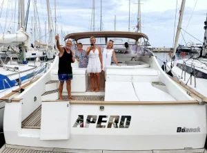 The APERO is a Solare 40, 12 metres in length that can accommodate 8 people very comfortably. The APERO has an onboard bathroom and cabin. It has a Bimini for shelter (if needed), a great music system with external speakers, front and rear sundeck and a bathing platform with ladder.